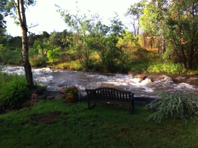 The creek is high, rushing, coffee colored. The surrounding trees are full and dark green, happy for a full drink of yesterday’s rain. The Flatirons sit pretty in the distance looking down on the plains with barely a glow of early morning light from a vast, cloudy, yet blue Colorado sky. Birds and hidden animals take delight in the moist air and cool temperatures, and so do I.