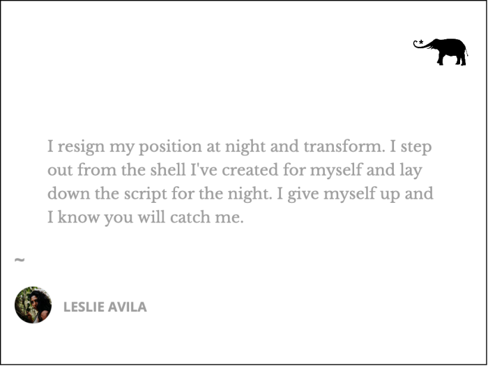 I step out from the shell I’ve created for myself and lay down the script for the night. I give myself up and I know you will catch me. Peace be with me for I am forever with you.